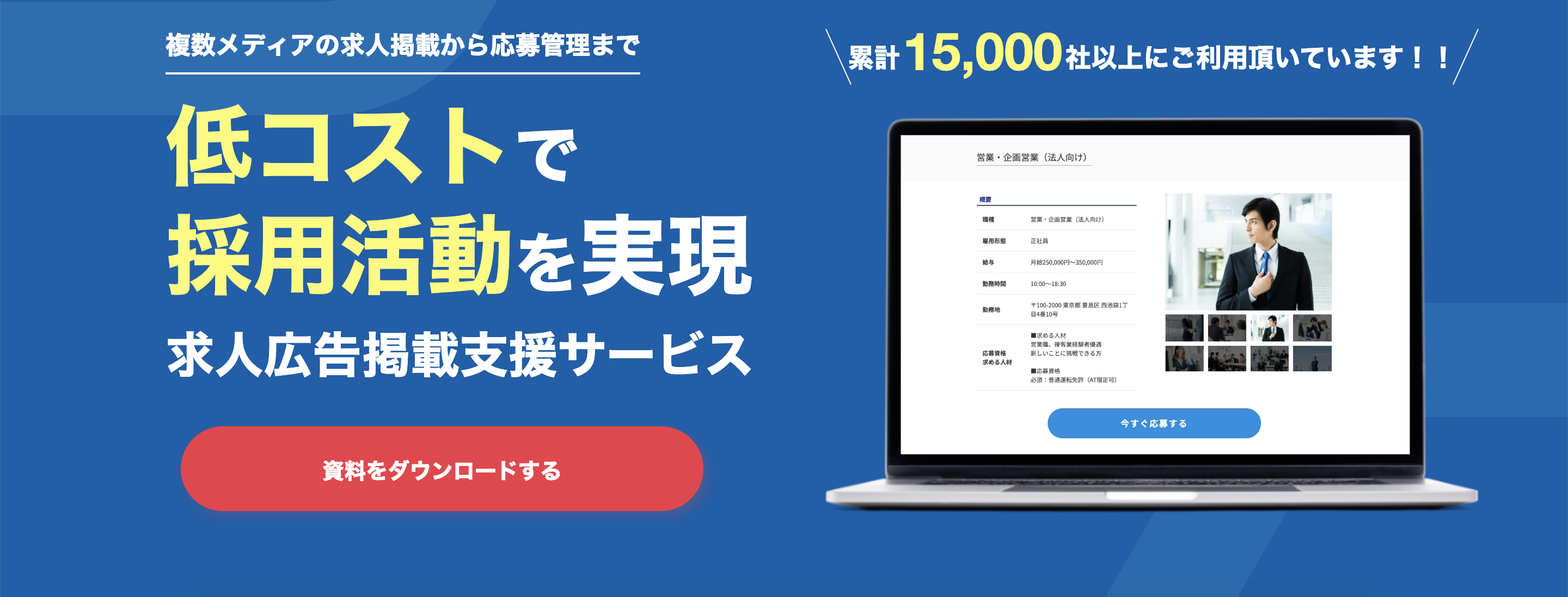 採用サイト作成から応募者集客まで対応した採用サイト作成サービスです。 Indeedをはじめ、22の求人サイトへ一括連携し運用代行まで可能! すぐに求人を開始&応募を集めることができます。 さらに応募者を一括管理、運用は完全お任せ!