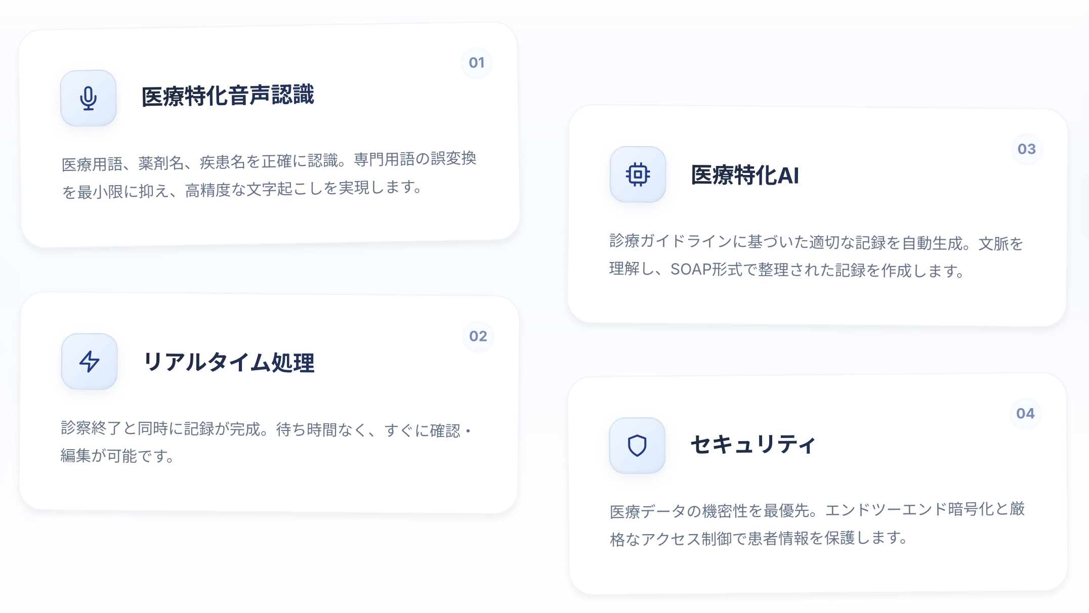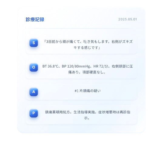 診察中はメモを取る余裕もなく、後から記憶を辿って記録を作成。 患者の細かな訴えや重要な所見が抜け落ちてしまいます。